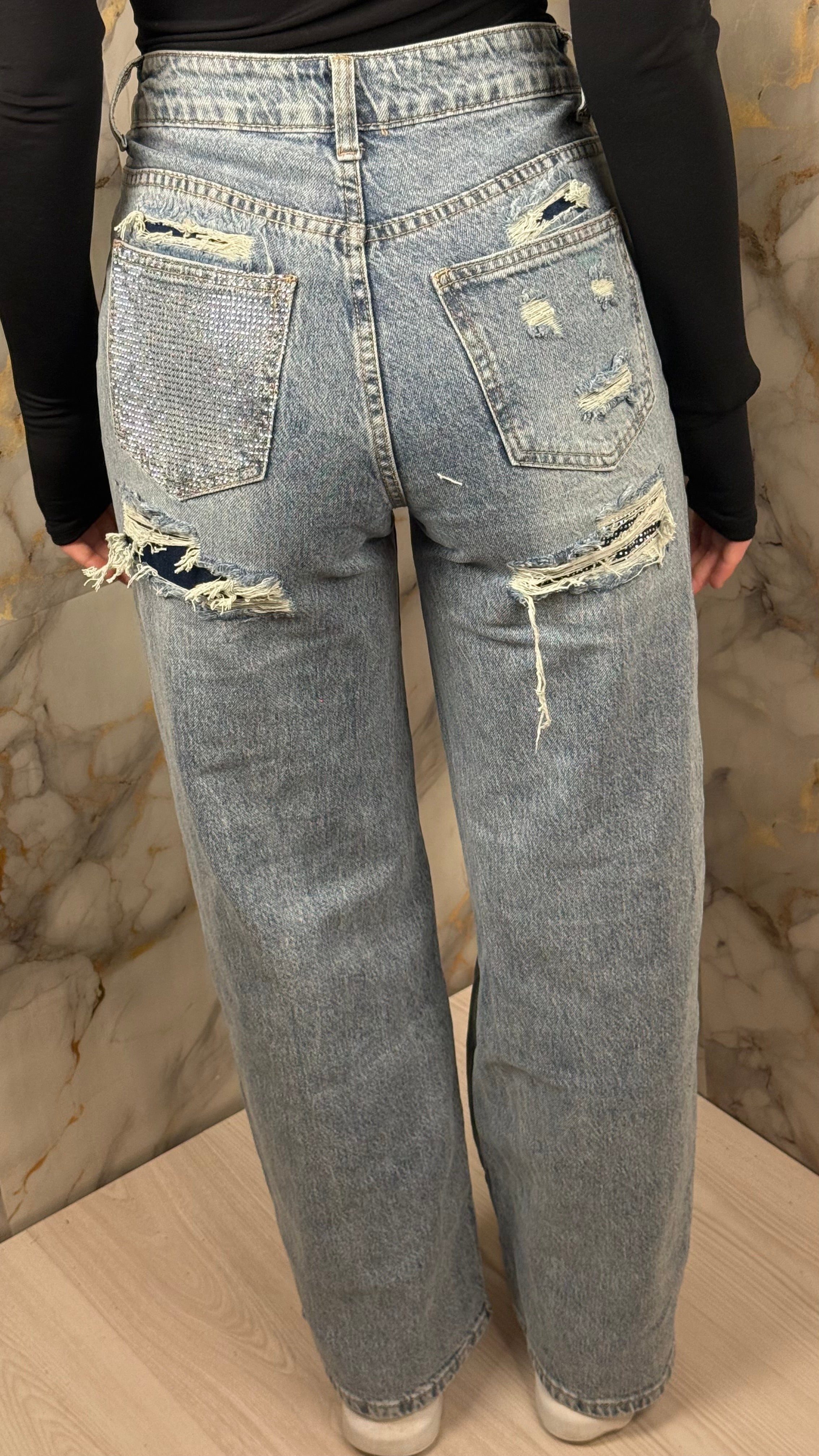 Sul retro, un dettaglio luminoso applicato sulle tasche aggiunge un accento raffinato e discreto, pensato per emergere con equilibrio e carattere.