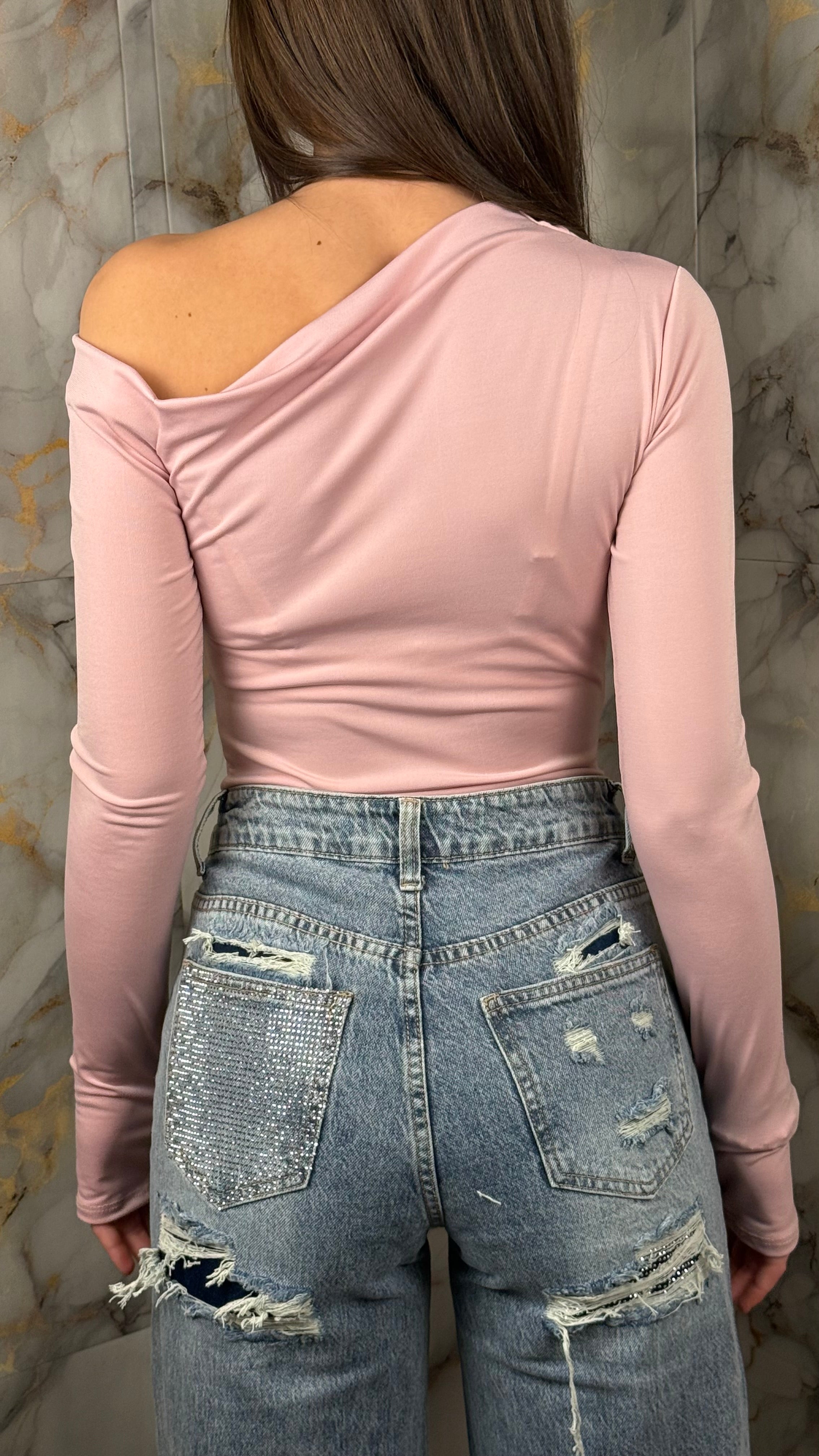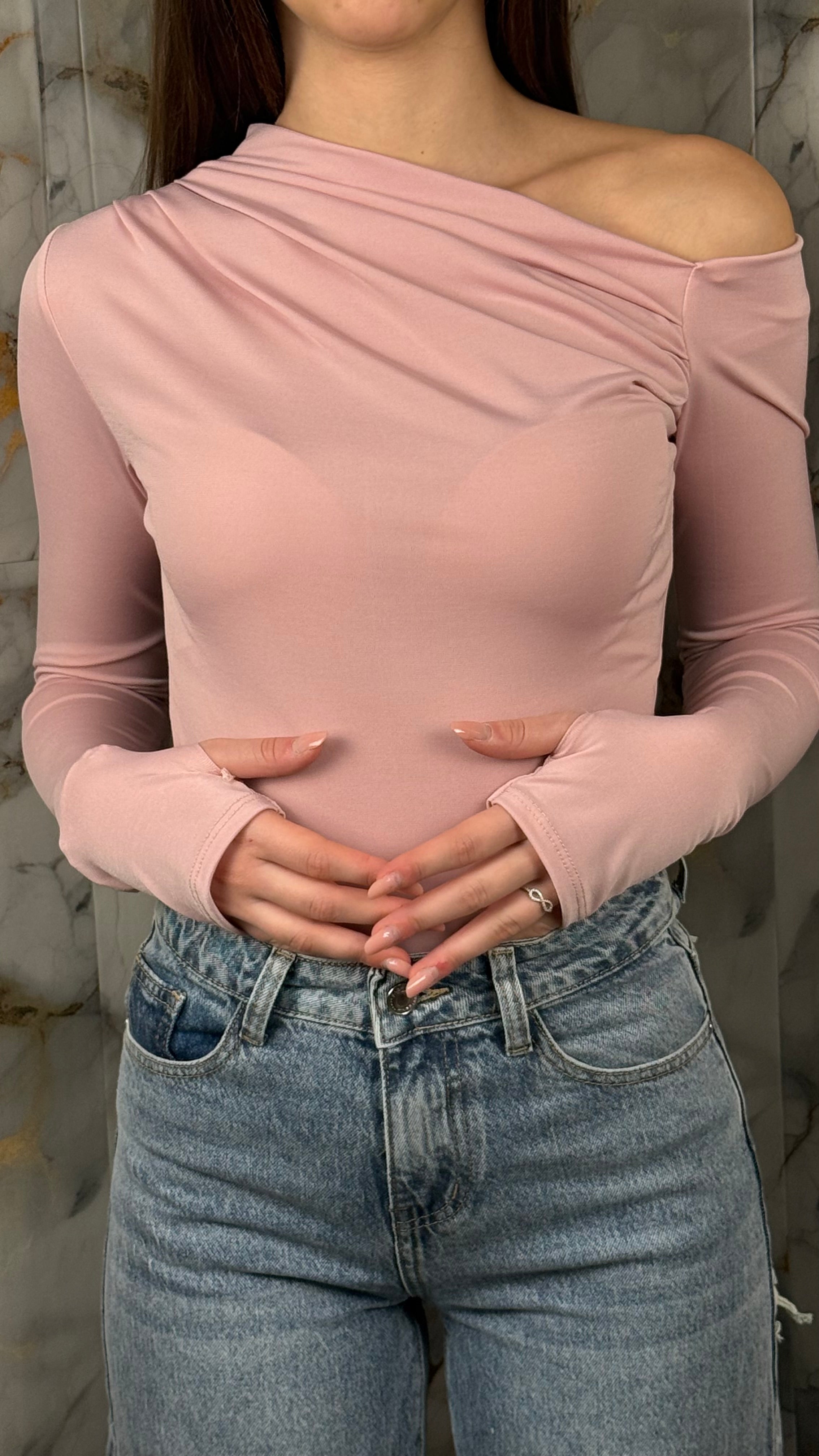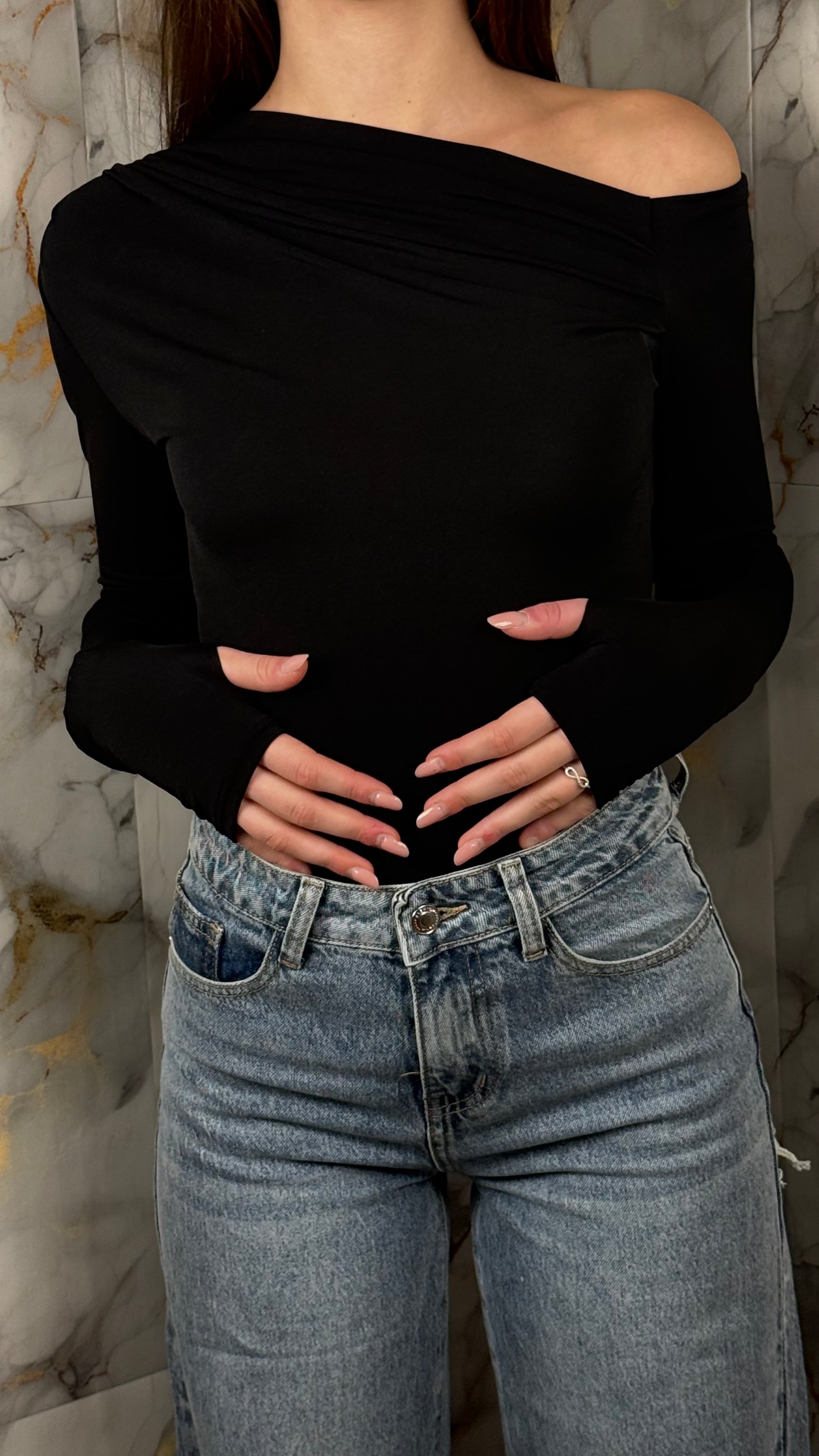 La spalla asimmetrica e il dettaglio copri-mano aggiungono carattere senza appesantire il look, rendendolo perfetto sia per outfit quotidiani che per styling più ricercati.